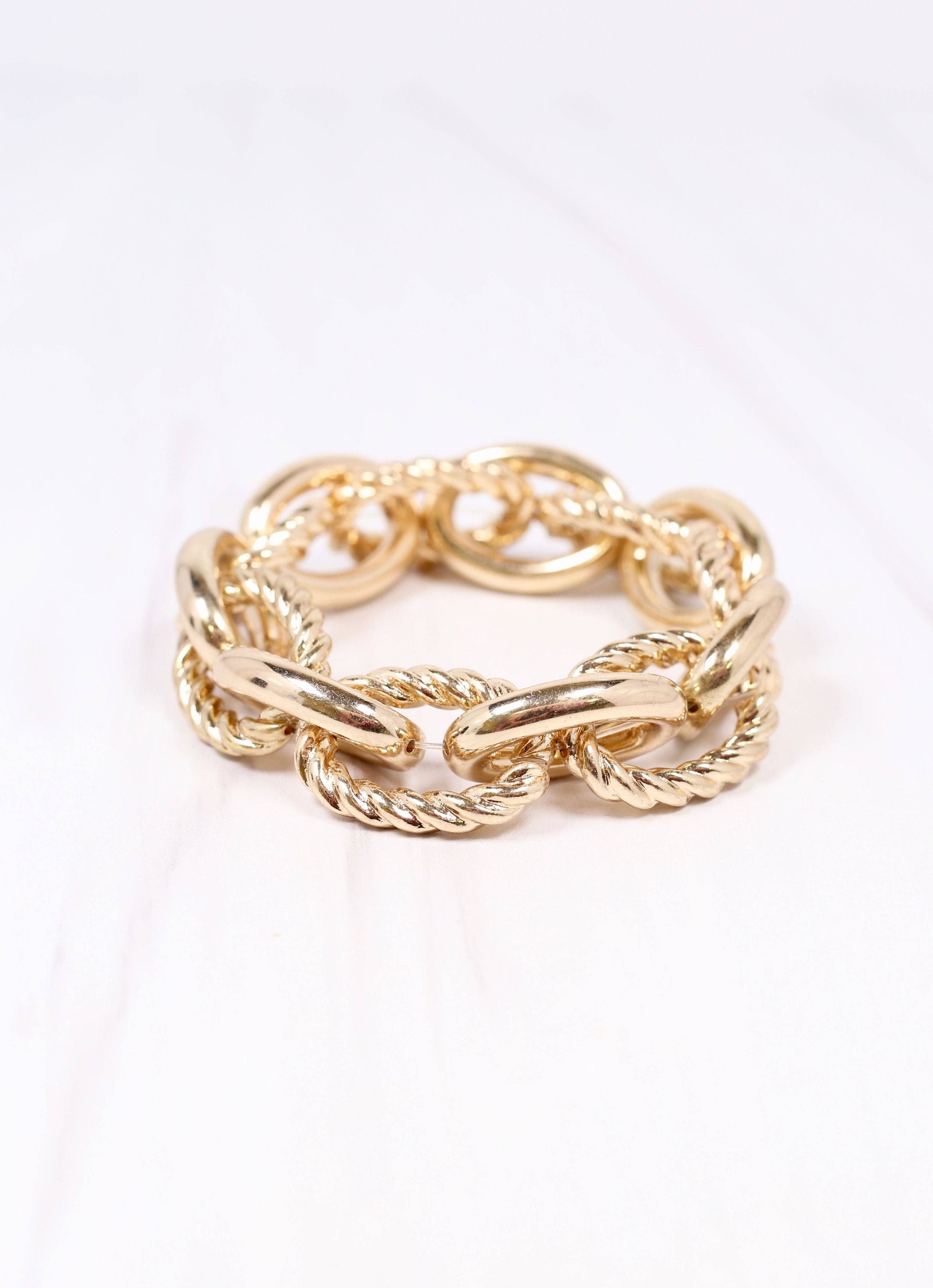 This larger link bracelet features a mix of smooth and textured links and is designed to stretch to fit most wrists. It serves as a stylish statement piece on its own or can be layered in a bracelet stack for added flair.