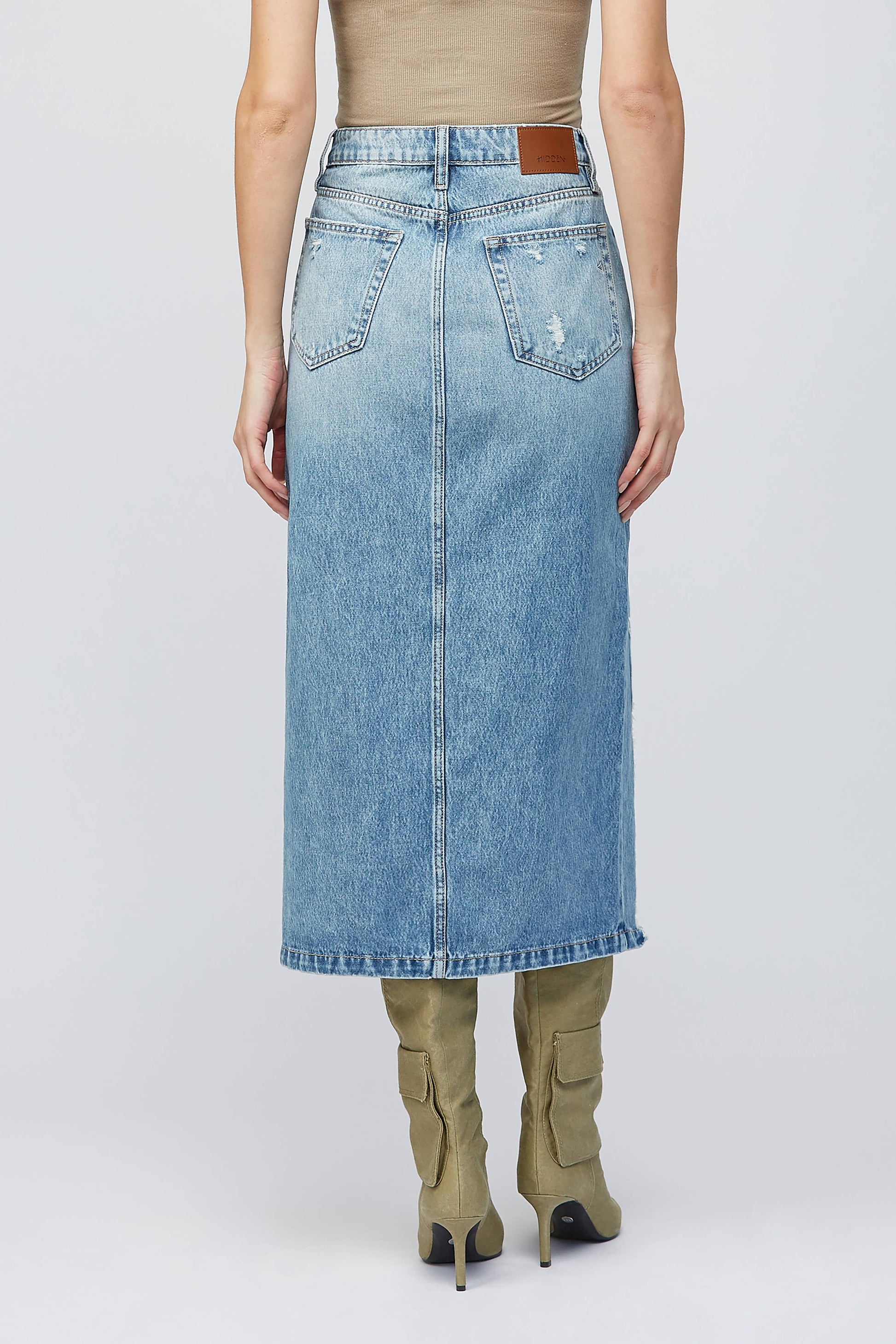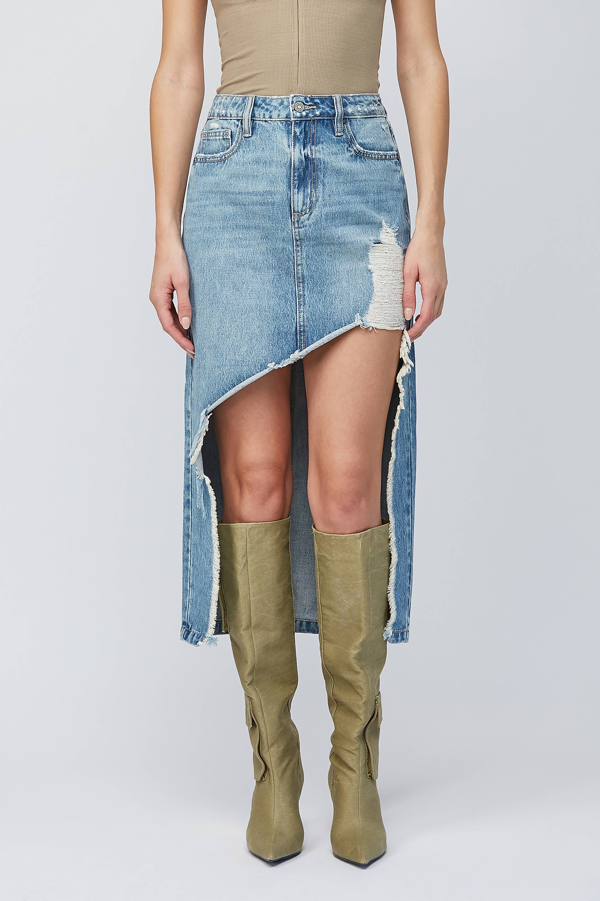 This medium-wash denim skirt brings bold texture and effortless edge to your fall lineup. Designed with a flattering high waist, subtle distressing, and a longline silhouette that moves with you—from slow mornings to statement nights. Pair it with boots, layers, or a graphic tee and let the fringe fly.