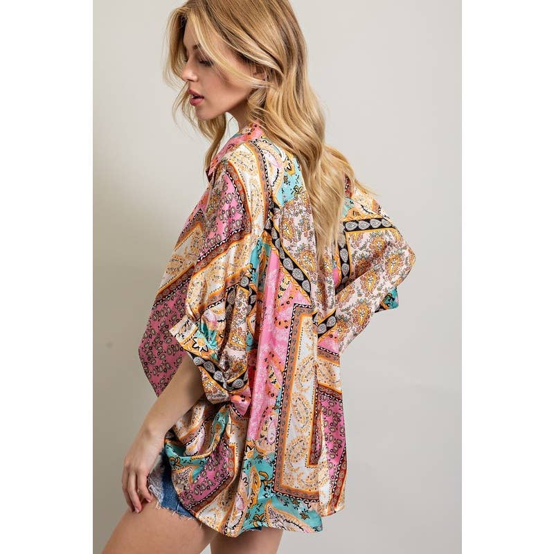 Satin Print Half Sleeve Flowy Button-Down Shirt Top crafted from super soft, lightweight satin print fabric. Features classic stand collar details.